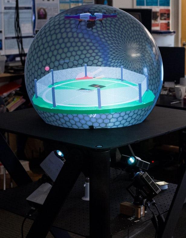 24英寸的水晶球使用四个精确校准的高速投影机来生成一个球形图像。多达两名参与者可以使用轻型可跟踪的分频眼镜看到球内不同画面。系统将根据相对于水晶球的位置,动态跟踪用户位置,为每个观察者有效地产生单独的图像,所有这些图像将一起投射到球的表面,而眼镜将过滤掉除了用户自己的视图以外的所有画面。该团队计划开发出一种设计方案,以便将来能够支持多达四个观众。