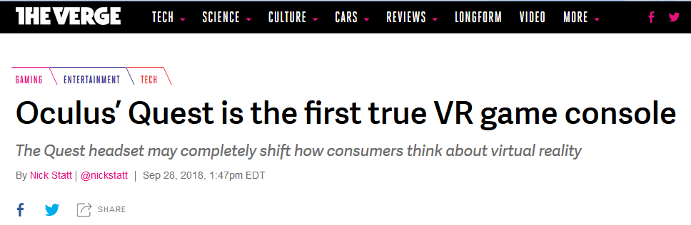 此次新品的推出,也引发了外媒的大力赞扬。The Verge 文章称赞Oculus Quest是第一款真正的VR游戏控制器;