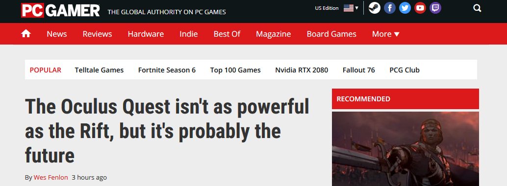 PC Gamer认为Oculus Quest虽然不像Rift拥有极其强大的性能,但是很可能代表了未来的发展趋势。